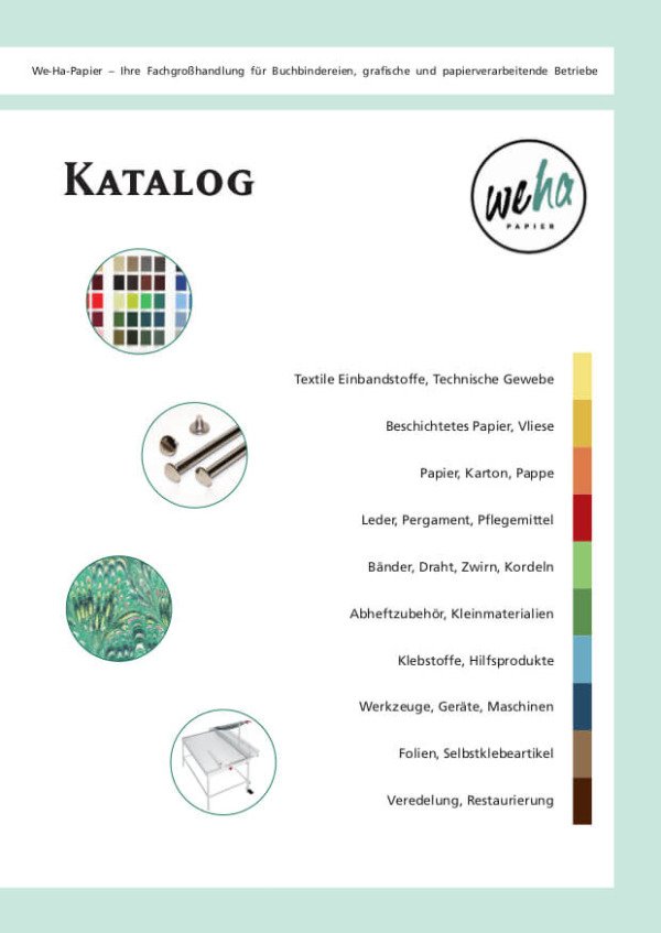 We-Ha-Papier wird 65 Jahre alt! Bis heute bleibt We-Ha-Papier dem Handel mit graphischen Bedarfsartikeln verbunden. Zur Kundschaft gehören Industrie- und Handwerksbuchbindereien, Druckweiterverarbeiter und zunehmend Betriebe aus der Kreativwirtschaft. Langjährige Verbindungen bestehen auch zu öffentlichen Auftraggebern wie Archiven, Restaurierungseinrichtungen, Bibliotheken und Schulen.